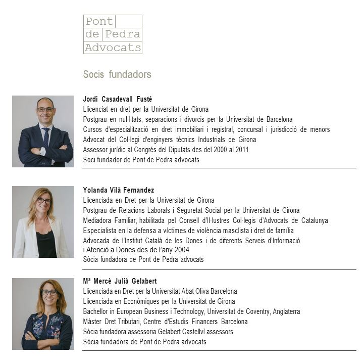 Els lletrats de Pont de Pedra Advocats actuen, entre d’altres, com assessors jurídics de l’Institut Català de les Dones de la Generalitat de Catalunya i Atenció de Dones de comarques Gironines, RACC, Denúncies Col·lectives, Col·legi d’enginyers de Girona i també com a departament jurídic de l’Assessoria Gelabert Castellví assessors.